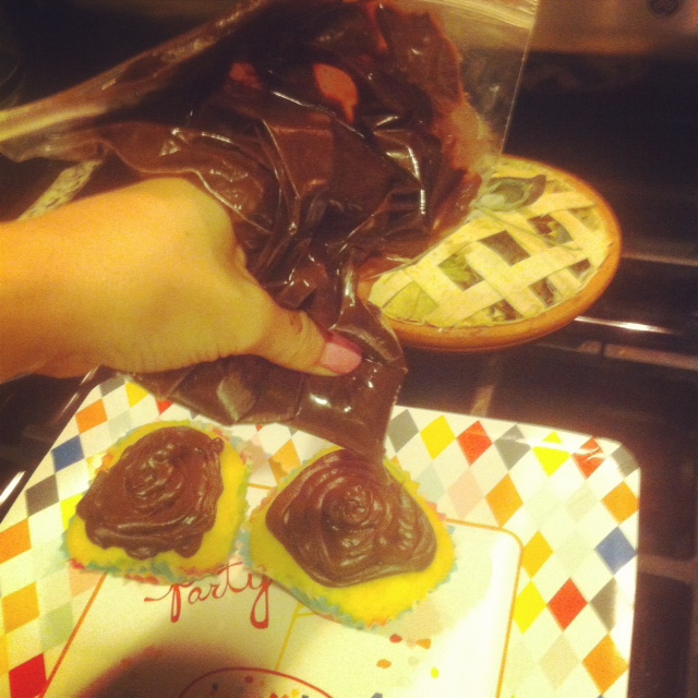 I tried a new way to frost my cupcakes too! A DIY frosting tool-A handy Ziploc bag-just add the frosting into a Ziploc bag and squeeze the frosting on in a circular direction. How fun! If this is your first time like it was for me, don’t actually seal the bag, twist the top of it so it doesn’t explode!